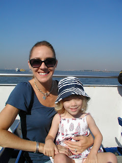 Today, we hopped the Ellis Island ferryboat from Brooklyn to enjoy a walking tour of Ellis Island and the Statue of Liberty. This was a truly fun day for Paige and Taylor. Not only did they get to ride on a "big, big boat" (their words) but they also got up close and personal to the "big, green Statue of Liberty" (their words). One funny story I must tell before my age gets the best of me and I forget: After we'd walked around the grounds and looked upon the Statue of Liberty, we came to an area where we wanted to snap a few family pictures. There was a 3-foot high marble stone upon which I lifted the girls - thinking that they could stand atop the marble stone and almost stand shoulder to shoulder to mommy and daddy in the photos - well, as soon as I had picked them up and the bottoms of their feet touched down on that marble stone, the protests began. Taylor began to wimper and cry, saying: "I don't want to be like the statue" and Paige echoed the same sentiment. So funny isn't it?! The twins loved looking at the "big, green Statue of Liberty" (their words) from a distance and they obviously had studied Lady Liberty's stance upon the rising block of stone...but, really, who knew that they would be so smart and clever as to correlate their impressions of Lady Liberty to their own experiences?! Gosh, these kids really amaze me sometimes...they are just sooooooo smart and today was one of those moments when I was pleasantly surprised ONCE AGAIN how marvelously attuned they are to their worlds, their experiences in this world and their understanding of the world around them. That's right, Lady Liberty, we can gaze upon you, but don't think for one second that the twins want to be hoisted upon a marble block of stone like you and become "like the statue" you are (not even for a cute photo opp)! Ha, ha, ha.